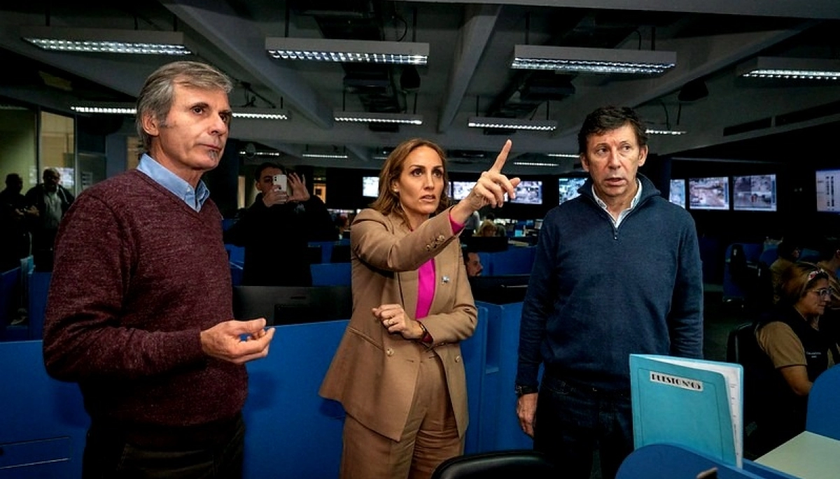 Gustavo Posse, intendente de San Isidro y Florencia Arietto, dirigente de Juntos por el Cambio, visitaron la sala de control donde se supervisan las imágenes de las más de 2.000 cámaras distribuidas en todo el municipio.