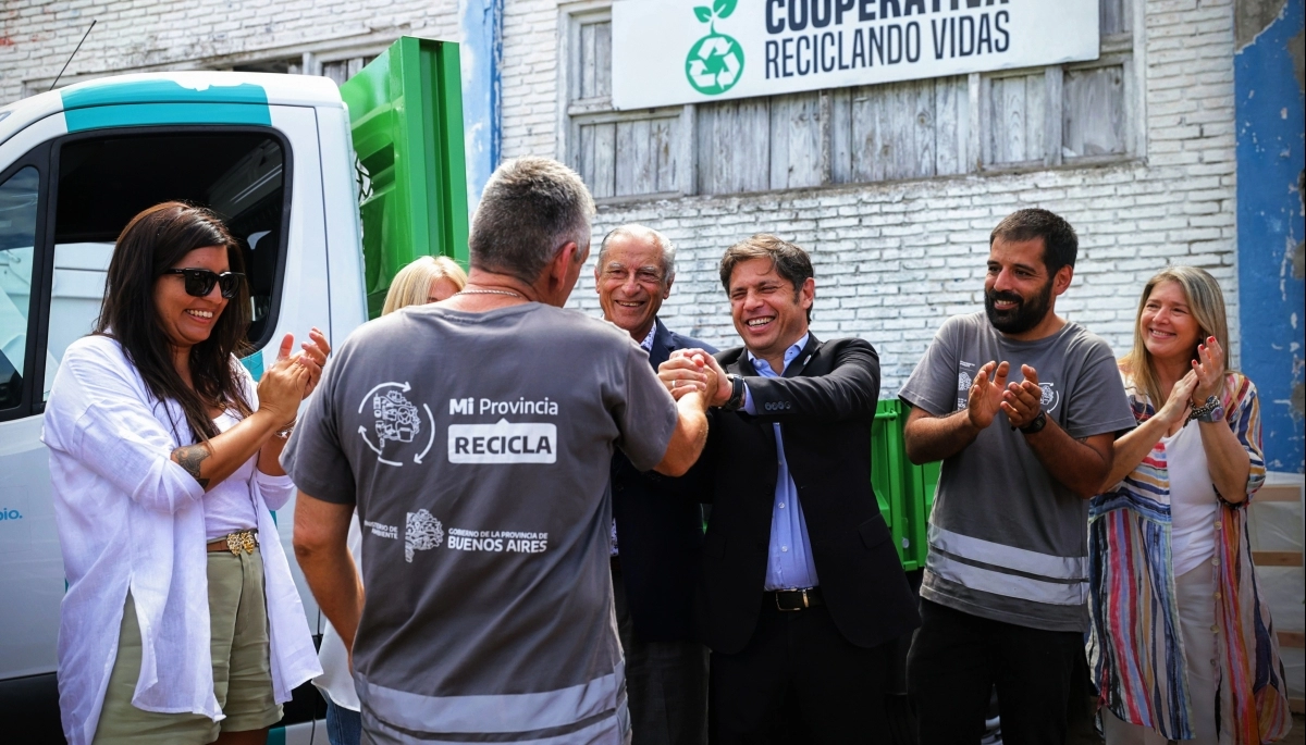 Axel Kicillof, gobernador de la Provincia de Buenos Aires, recorrió una planta de reciclaje en el municipio de La Costa, acompañado por Daniela Vilar, ministra de Ambiente bonaerense, en un acto que hizo entrega de un camión de caja abierta para recolección diferenciada de residuos.