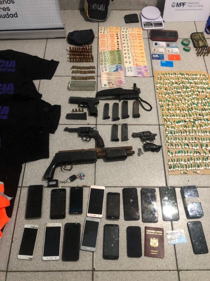 En los lugares donde se realizaron los procedimientos se hallaron uniformes apócrifos de la Policía Federal Argentina (PFA). También una pistola Taurus con numeración suprimida y cargador colocado con cuatro cartuchos en su interior; un revólver calibre 38 y una escopeta; 62 proyectiles de diferentes calibres, 76 balas de calibre 22, armas rotas y cargadores de pistolas vacíos.