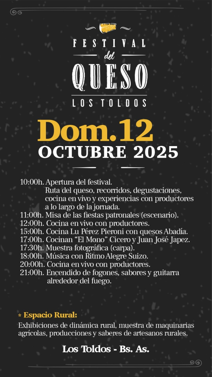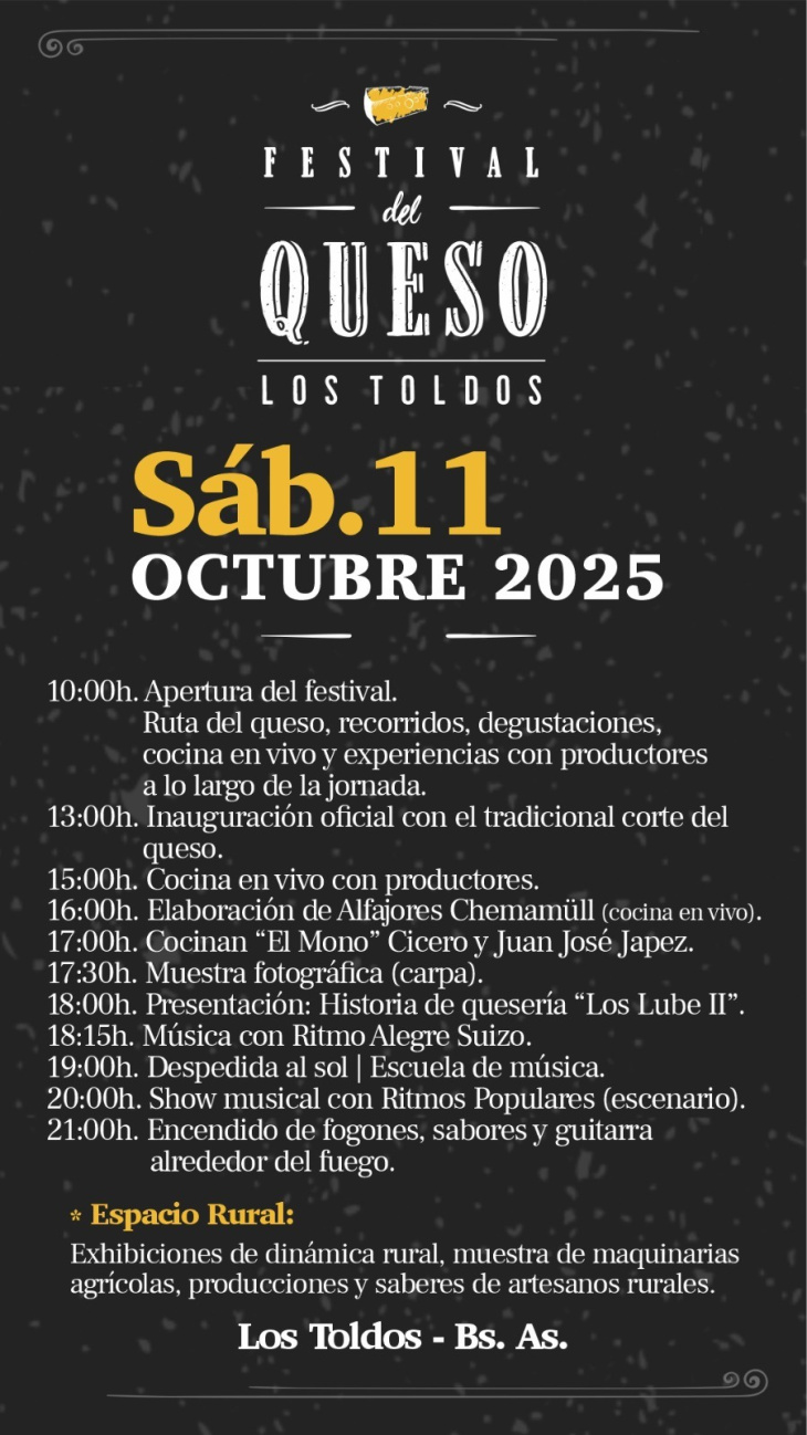 El evento se desarrollará durante el sábado 11 y domingo 12 de octubre, con una amplia programación que incluye más de 55 stands de productores locales y regionales, propuestas gastronómicas, espectáculos en vivo, actividades para toda la familia y recorridos por los establecimientos rurales donde nacen los sabores y saberes que distinguen al queso de Los Toldos.