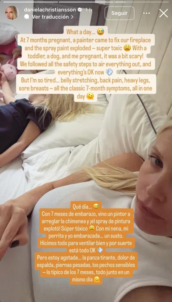 La imagen incluyó un texto escrito en inglés y traducido al español, sobre el mal momento que vivió en su casa de Ginebra. “¡Qué día! Con siete meses de embarazo vino un pintor a arreglar la chimenea y el spray de pintura explotó. Super tóxico. Con mi nena, mi perrita y yo embarazada... un susto. Hicimos todo para ventilar bien y por suerte está todo ok", escribió.