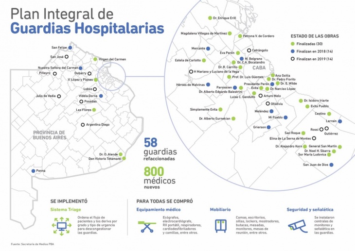 El plan de guardias contempla obras en 58 hospitales, de los cuales 22 corresponden a hospitales interzonales, como el Gandulfo de Lomas de Zamora, el San Martín de La Plata, el Evita de Lanús, el Penna de Bahía Blanca, entre otros.