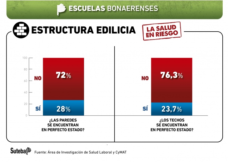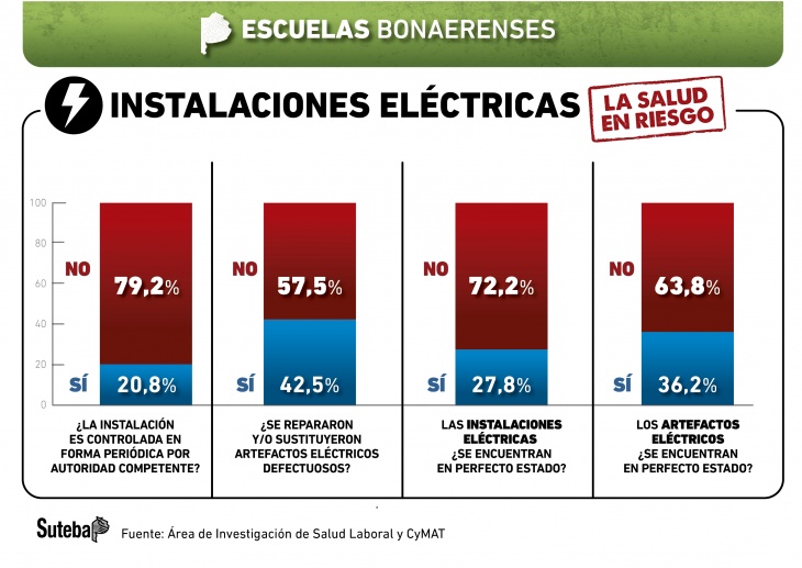 Asimismo, en cuanto a las instalaciones de electricidad, desde SUTEBA indicaron que “en un 79,2 por ciento de las escuelas relevadas no se realizan comprobaciones preventivas de las instalaciones en forma periódica por autoridades competentes; en un 72,2 por ciento las instalaciones eléctricas no se encuentran en perfecto estado de conservación y funcionamiento; y en un 57,5 por ciento no se realiza la reparación y/o sustitución de artefactos eléctricos defectuosos”.