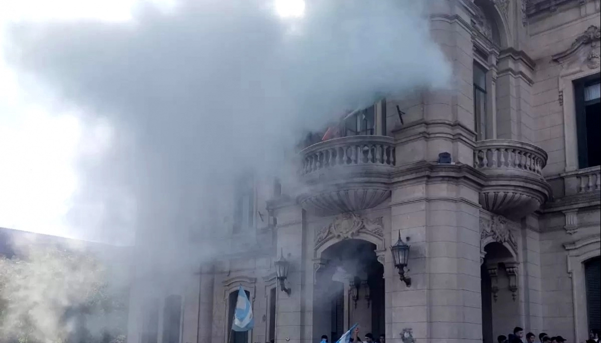 Sin embargo, según informó el diario La Voz del Pueblo, la situación en un momento se salió de control, por lo que una serie de personas rompieron vidrios, ingresaron al edificio y vaciaron matafuegos.