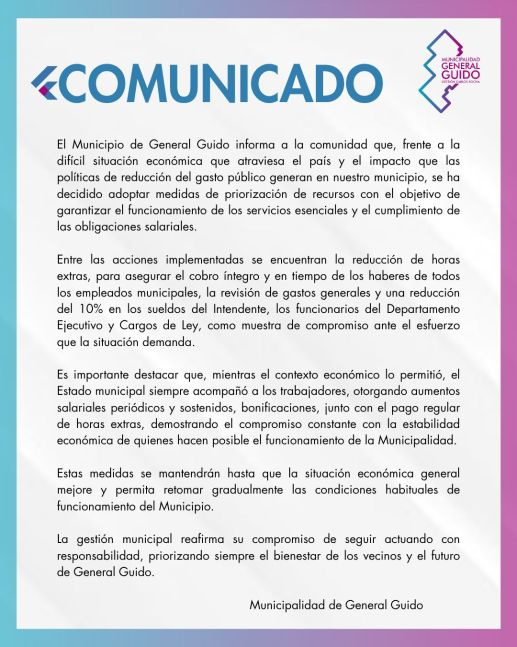 En las últimas horas, el Municipio de General Guido informó que frente “a la difícil situación económica que atraviesa el país y el impacto que las políticas de reducción del gasto público generan en nuestro municipio, se ha decidido adoptar medidas de priorización de recursos con el objetivo de garantizar el funcionamiento de los servicios esenciales y el cumplimiento de las obligaciones salariales”.