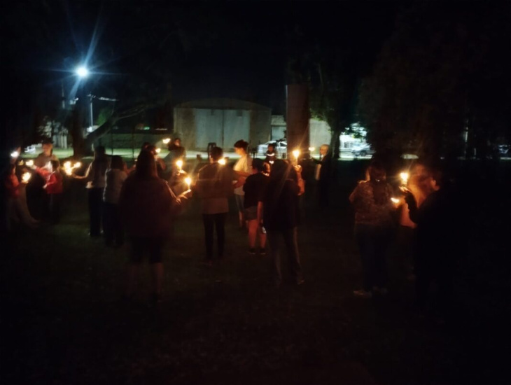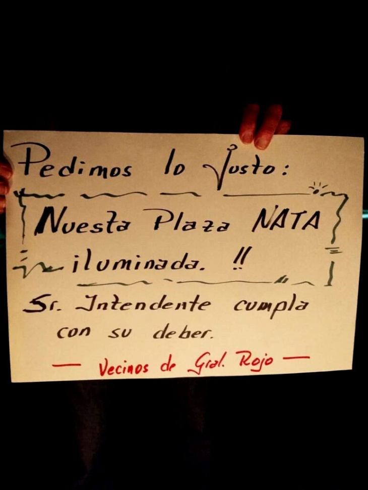 Cerca de las 21:00 y cuando la plaza se encontraba a oscuras por el corte del suministro eléctrico, los vecinos de General Rojo se manifestaron con velas en la plaza principal.