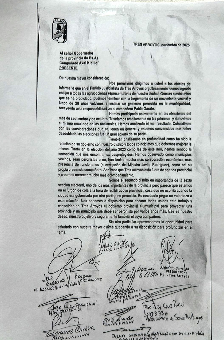 “Nos permitimos dirigirnos a usted a los efectos de informarle que en el Partido Justicialista de Tres Arroyos orgullosamente hemos logrado cobijar a todas las agrupaciones representativas de nuestra ciudad. Gracias a nuestra unión que se ha propiciado, pudimos terminar con la hegemonía de un Movimiento Vecinal y luego de 20 años volvimos a instalar un gobierno peronista en la municipalidad recayendo esta responsabilidad en el compañero Pablo Garate", inicia el texto.