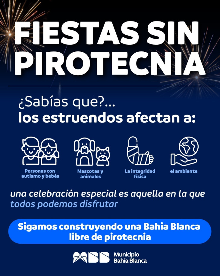 "En estas fiestas, elijamos celebrar sin lastimar. Sigamos construyendo una Bahía Blanca libre de pirotecnia, donde el festejo no se convierta en sufrimiento. Decirle no a la pirotecnia es elegir una ciudad más segura, empática y respetuosa. Cuidarnos es responsabilidad de todos", afirman desde el municipio.