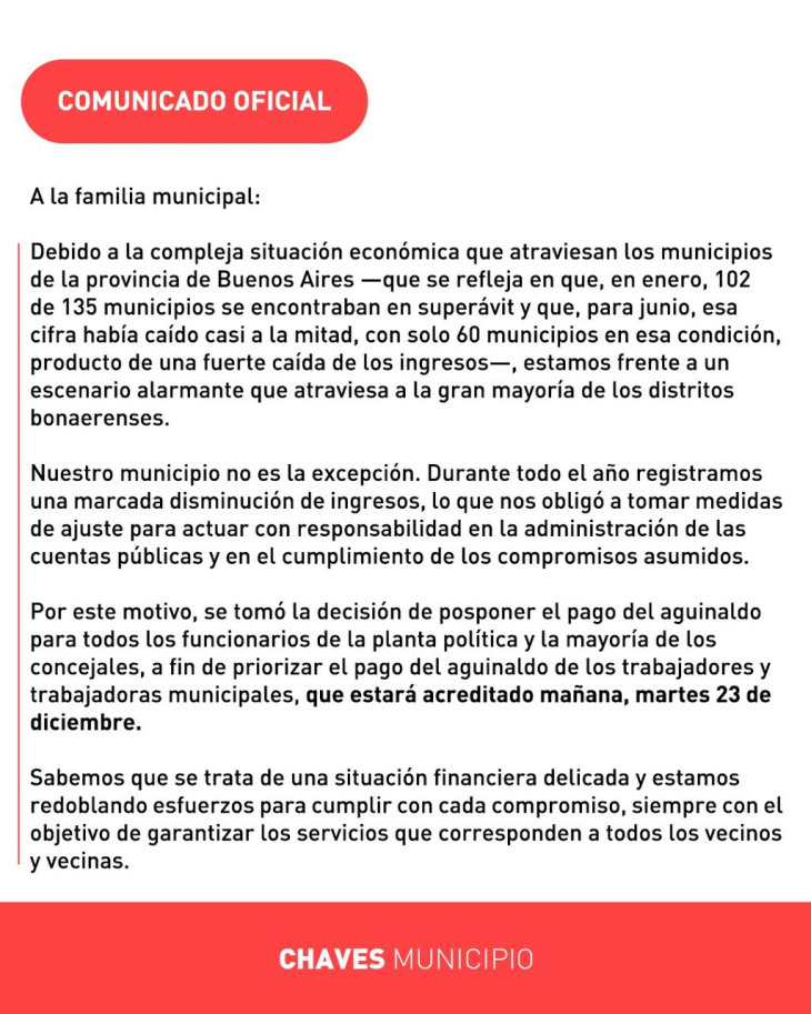 En ese escenario, desde Chaves Municipio expresaron que se vieron obligados a implementar medidas de ajuste y una administración más estricta de las cuentas públicas, con el objetivo de sostener el funcionamiento de los servicios esenciales y cumplir con los compromisos laborales asumidos con el personal municipal.