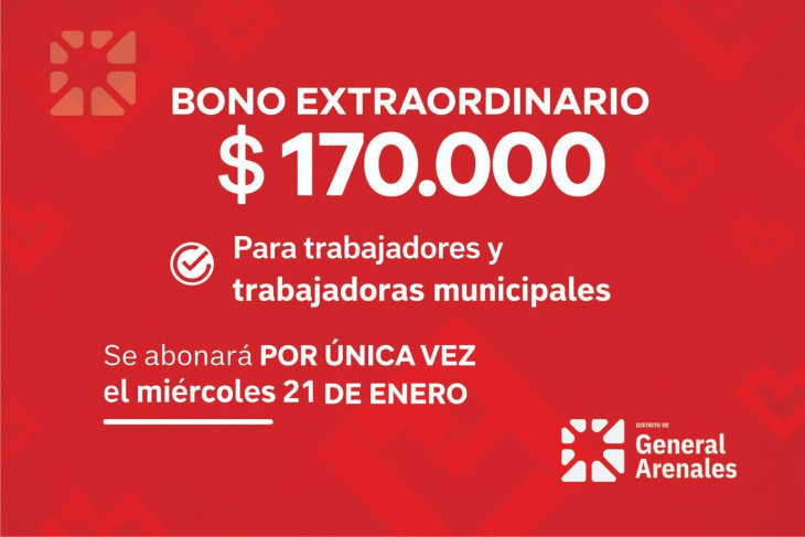 El Gobierno Municipal de General Arenales informa que el próximo miércoles 21 de enero se realizará el pago de un bono extraordinario, por un importe de $170.000, destinado al personal municipal. Quedan excluidos de esta medida los cargos electivos.