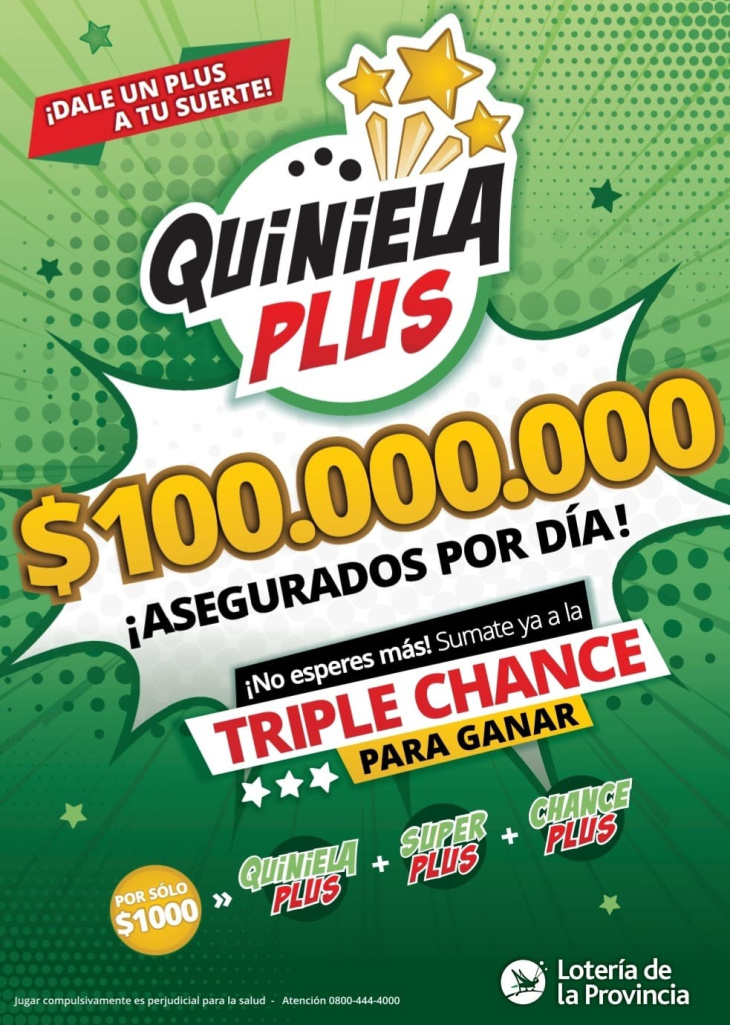 La Quiniela Plus se puede jugar en la agencia de lotería más cercana eligiendo 8 números de dos cifras, de un universo del 00 al 99. El valor de la apuesta es de $1.000, y ofrece tres chances de ganar: Quiniela Plus, Super Plus y Chance Plus. El pozo mínimo asegurado de la Plus es de $60 millones.