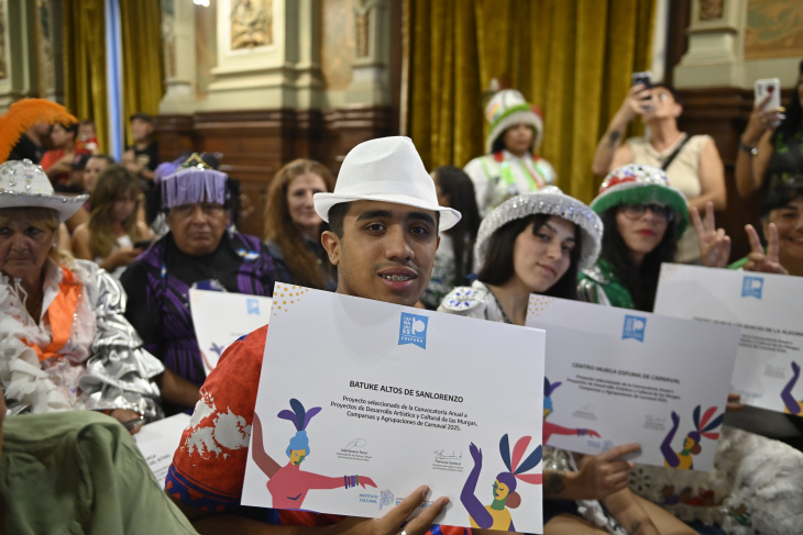En el marco de la ceremonia también se entregó el reconocimiento “Alegría Popular”, una distinción especial que pone en valor el trabajo de referentes carnavaleros desde una perspectiva de derechos humanos. En esta edición, la murga Pateando Tristezas, del municipio de Merlo, fue destacada por su trayectoria y aporte comunitario.