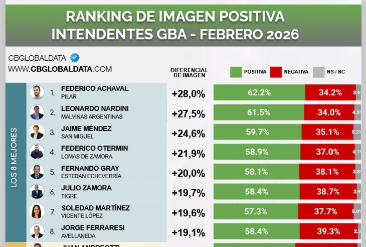 La consultora CB Global Data difundió su ranking de intendentes del Conurbano bonaerense correspondiente a febrero de 2026 y dejó un mapa con contrastes marcados entre los jefes comunales mejor posicionados y aquellos que atraviesan un escenario adverso. El estudio, realizado entre el 4 y el 8 de febrero sobre 18.804 casos en los 24 principales municipios del GBA, ordenó a los alcaldes según su diferencial de imagen (positiva menos negativa).