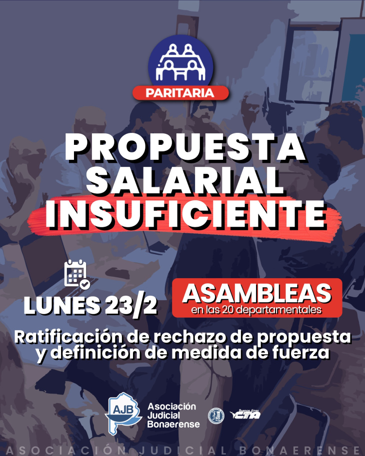 La Asociación Judicial Bonaerense rechazó el aumento del 3% para febrero ofrecido por la gestión de Axel Kicillof y anunció que el lunes realizará asambleas para definir si convoca a un paro. La decisión se conoció tras una reunión virtual en la que el gremio desestimó la propuesta en línea con otros estatales.