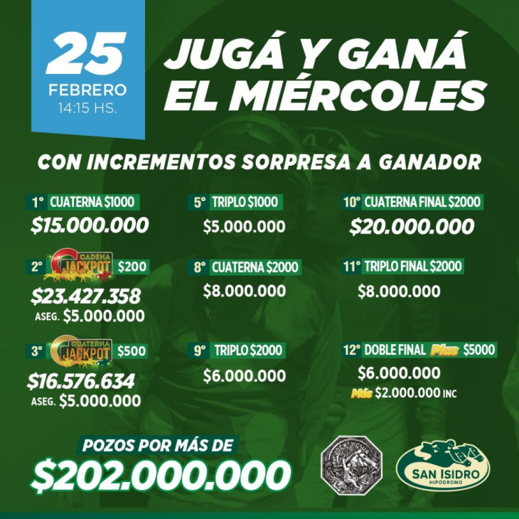 La carrera central irá en el octavo turno, a las 17.45, y forma parte de la tradicional fecha de mitad de semana del HSI. Además del atractivo deportivo, la jornada contará con incrementos en las apuestas, un condimento extra para los aficionados que acompañan cada miércoles la propuesta del circo hípico.